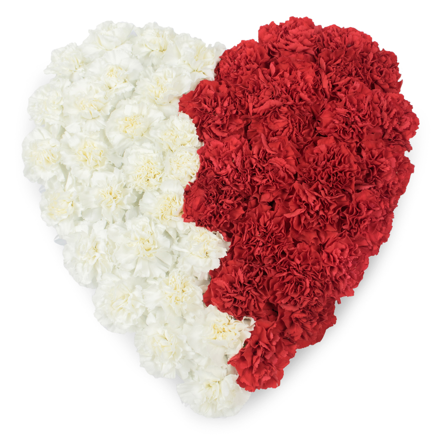 Our charming heart-shaped bouquet combines the elegance of white and red carnations, each hand-selected for their exquisite beauty and freshness. This unique arrangement is perfect for expressing sympathy or love with a touch of sophistication.
