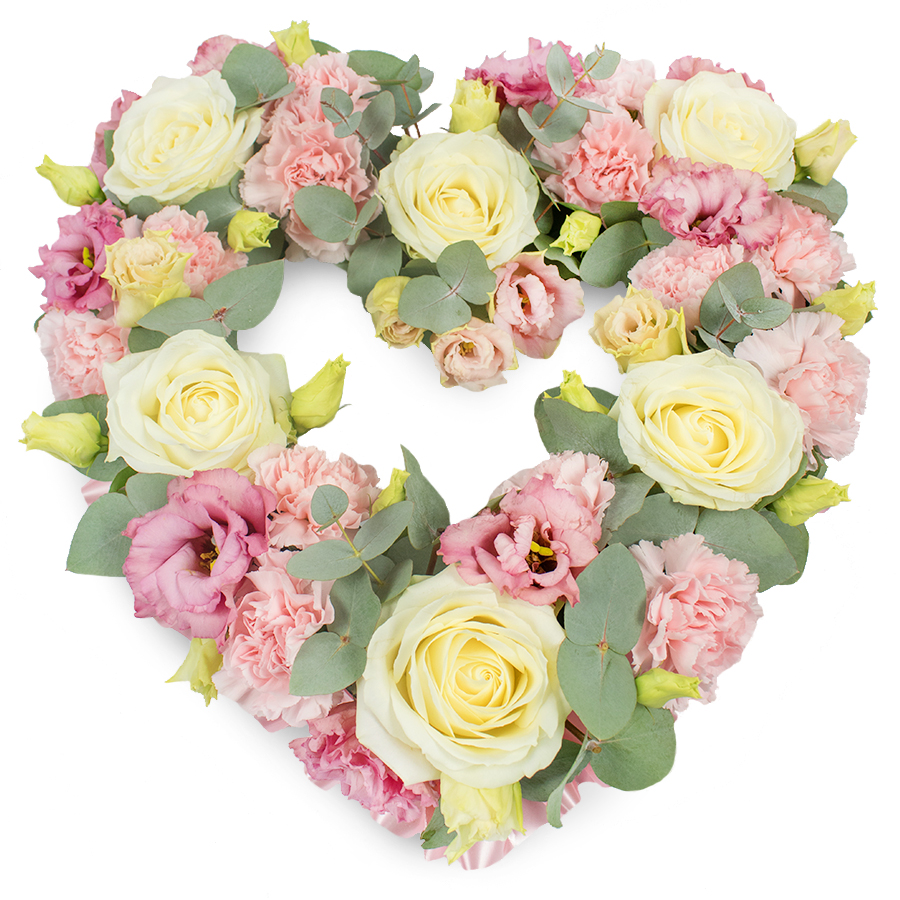 Show your deepest sympathies with our Luxurious Heartfelt Bouquet. This exquisite arrangement features a sophisticated selection of white roses, pink carnations, pink lisianthus, and lush eucalyptus leaves, creating a perfect tribute.