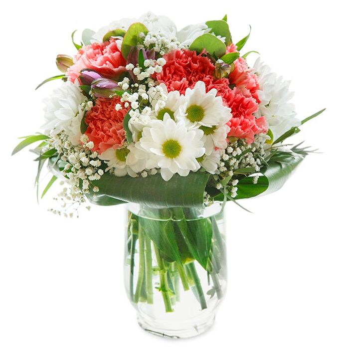 There is a celebratory vibrance to this bouquet, artistically assembled in a square white bag ready for gifting in Millwall. Coral, peach, and rich red carnations burst with ruffled softness, each one catching the light like petals at sunrise by the Thames. White daisies, their golden-green centers radiant, nestle among the carnations, while baby's breath adds a gentle cloud-like aura, evoking a sense of carefree happiness. Sleek, dark green leaves encircle the bouquet, providing both structure and a lush backdrop that enhances every flower. Tiny purple-tinged buds appear subtly to one side, a playful touch suggesting the promise of more blooms. The rounded shape and careful arrangement hint at the skill and heart of Millwall's local florists, who understand the power of a fresh bouquet to lift spirits whether for a birthday at Lanterns Court or a spontaneous gesture of affection on a walk near Island Gardens. The smooth white background amplifies the colours and forms, making the flowers appear almost within arm's reach. This arrangement encapsulates the pure joy and freshness of a thoughtfully curated floral gift, ready to make any occasion in the Millwall area a little brighter. Bathed in soft, natural light, this hand-crafted bouquet captures the essence of Millwall springtime with every detail. At its center, joyful white daisies shine with crisp petals and vivid green hearts, their brightness dancing above plush coral-pink carnations whose ruffled layers evoke playful movement and depth. Baby's breath weaves a mist of tiny blossoms, giving an ethereal lift reminiscent of fleeting clouds over the River Thames nearby. Eucalyptus leaves, matte and silvery, combine with deeper greens to provide both structure and gentle fragrance, mirroring walks through Millwall's leafy corners. Subtle hints of closed alstroemeria, dusted in purple and rosy streaks, add the promise of blooms yet to arrive-an ode to the season's ever-changing beauty. The round composition is expertly balanced, each flower placed as if in conversation with its neighbor. Overall, the effect is tranquil yet exuberant: a bouquet sculpted not only for visual delight but to stir memories of celebrations, new beginnings, and cherished connections across the Millwall community. Ideal for birthdays, anniversaries, or simply as a gesture to brighten someone's day, this bouquet stands as a testament to local artistry and genuine care, offered with same-day delivery across Millwall's vibrant streets. This fresh bouquet, thoughtfully composed by the Millwall waterfront, radiates joy and gentle sophistication. At its heart, plush coral-toned carnations, ruffled and full of movement, capture the warmth of a spring sunrise over the Thames. They are surrounded by snowy-white chrysanthemums and classic daisies with lively green-gold centers, each bloom contributing to a feeling of purity and youthful exuberance that matches the easy-going atmosphere of Millwall's local cafes and riverside terraces. Threads of delicate baby's breath entwine among the larger flowers, softening the bouquet into a cloud-like halo that brings the whole piece together. Bright green foliage, both broad and slender, frames the flowers and accentuates the sturdy lines of stems visible through water in a polished glass vase. From one side, a few tightly closed magenta alstroemeria buds provide a hint of future growth, deepening the palette and suggesting gentle change. The bouquet is arranged against a spotless white background, allowing its vibrant colours and textures to shine without distraction. Every element, from the luminous petals to the glossy green leaves, has been carefully placed to evoke a sense of comfort, hope, and celebration-making this arrangement a perfect choice for birthdays, new beginnings, or simply sending a note of cheer to friends and family across Millwall and the wider E14 area.